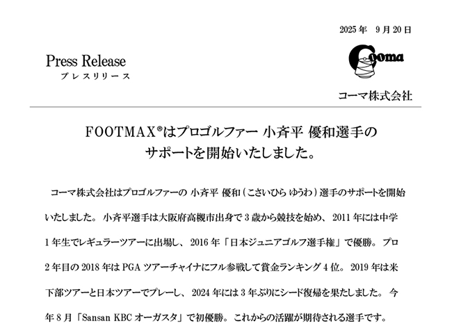 FOOTMAXはプロゴルファー 小斉平 優和選手のサポートを開始いたしました。